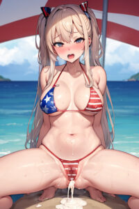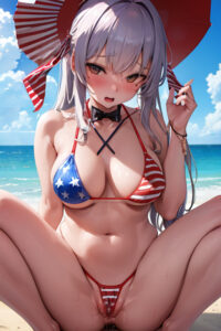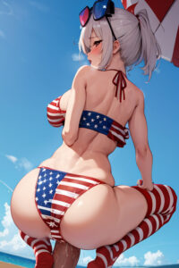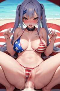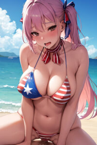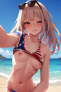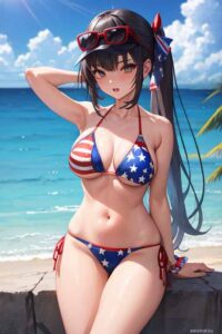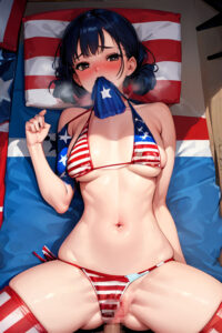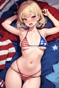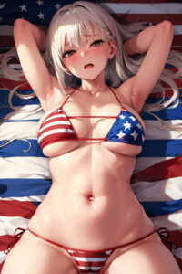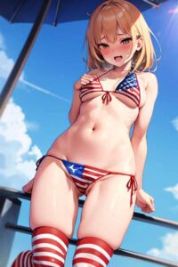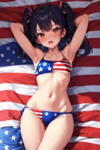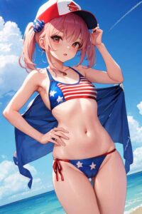 ヘア&メイクとの調和:赤いリップやネイル、白シャツの前結びなどを取り入れると、アメリカ国旗ビキニ水着とのリンク感が強まります。